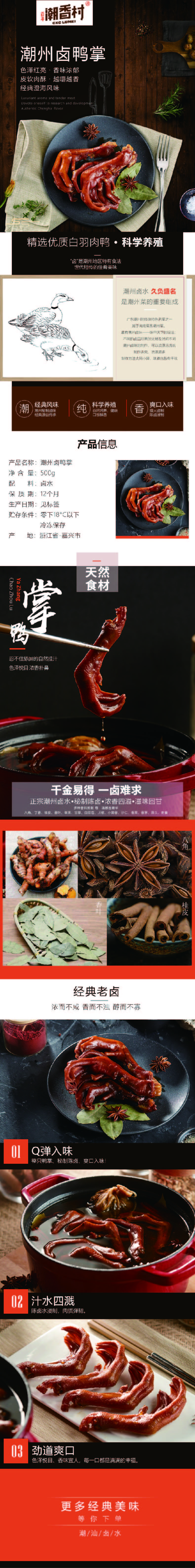產(chǎn)品介紹:潮州鹵鴨掌——選用新鮮上好鴨掌,色澤紅亮,香味濃郁,皮軟肉酥,越嚼越香,百年經(jīng)典美味傳承,親友團(tuán)聚,佐酒小酌首選佳肴。